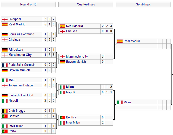У півфіналі Реал зіграє, швидше за все, з Ман Сіті, який має фору в 3 м'ячі над Баварією. А в іншому півфіналі очікується міланське дербі: Мілан зустрінеться з переможцем пари Інтер – Бенфіка, у першому матчі якої італійський клуб забезпечив собі гандикап у 2 м'ячі.