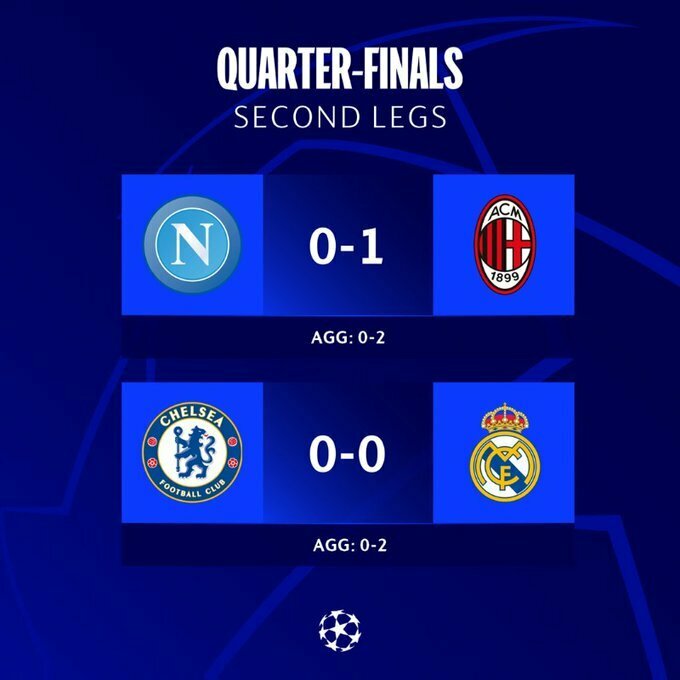 Визначено двох із чотирьох півфіналістів турніру. Реал вдруге переграв Челсі (2:0, 2:0) та вийшов у півфінал ЛЧ.