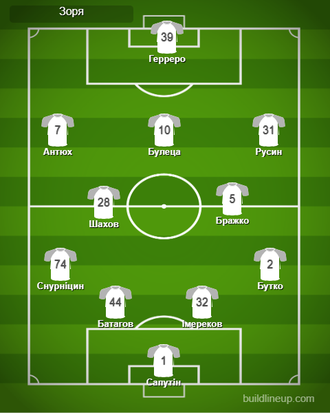 «Зоря»: Сапутін, Батагов, Імереков, Снурніцин, Бутко, Бражко (Дришлюк, 68), Шахов, Булеца (Полегенько, 81), Антюх (Вантух, 58), Русин (Хахльов, 81), Герреро (Мишньов, 68).