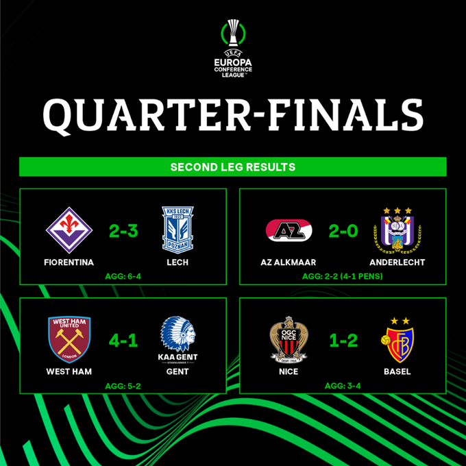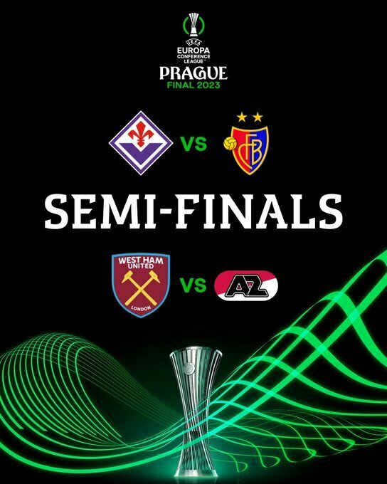 У півфіналі Ліги конференцій зіграють італійська «Фіорентина» та швейцарський «Базель». А в іншій парі за вихід у фінал посперечаються англійський «Вест Хем» та нідерландський АЗ Алкмар.