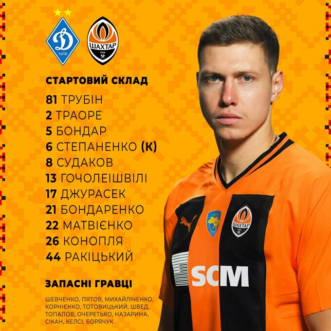 «Шахтар»: Трубін – Матвієнко, Ракіцький (Михайліченко, 60), Бондар, Конопля – Степаненко – Судаков, Джурасек (Назарина, 61), Бондаренко, Гочолеішвілі (Швед, 75) – Траоре (Сікан, 75).