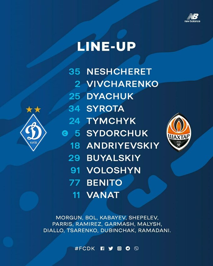 «Динамо» Київ: Нещерет – Вівчаренко, Дячук, Сирота, Тимчик – Андрієвський, Сидорчук – Волошин (Гармаш, 75), Буяльський (Царенко, 75), Беніто – Ванат (Рамірес, 75).
