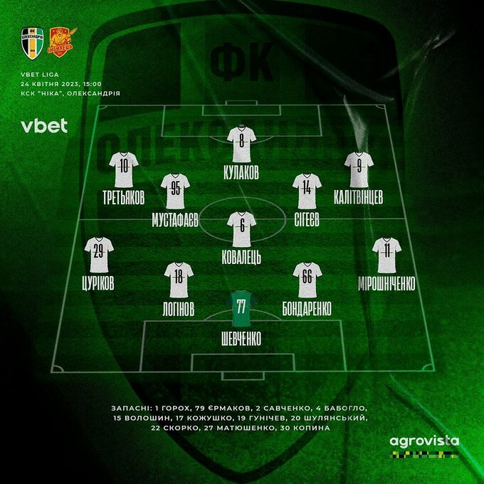«Олександрія»: Шевченко – Цуріков (Копина, 39), Логінов (Савченко, 37), Бондаренко, Мірошніченко – Ковалець, Сігеєв, Мустафаєв (Волошин, 75) – Третьяков, Кулаков (Шулянський, 58), Калітвінцев (Кожушко, 57).
