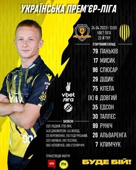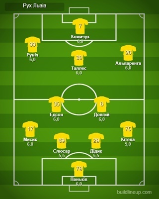 «Рух»: Паньків – Кітела (Лях, 46), Дідик, Слюсар, Мисик (Столярчук, 72), Довгий (Підгурський, 61), Едсон (Карабін, 72), Б.Таллес, Альваренга, Руніч (Теслюк, 90), Климчук.