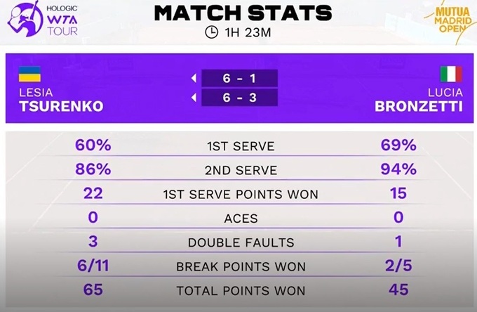Леся Цуренко (Україна) – Лючія Бронцетті (Італія) – 6:1, 6:3