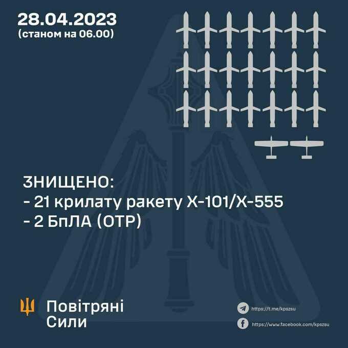 Підрозділами зенітних ракетних військ Повітряних Сил ЗС України у взаємодії із ППО інших складових Сил оборони знищено 21 із 23 крилатих ракет Х-101/Х-555, а також два БпЛА оперативно-тактичного рівня.