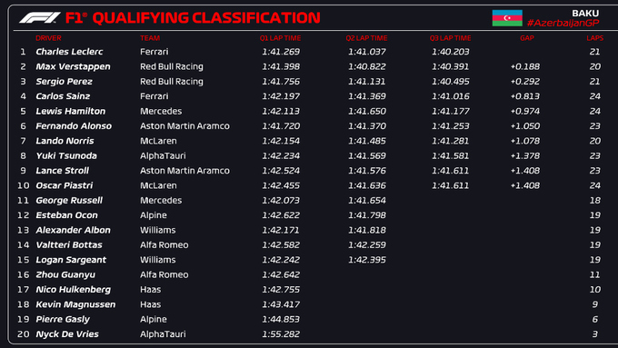 Поул на вулицях Баку взяв пілот Феррарі Шарль Леклер, який на швидкісній трасі зумів випередити гонщиків Ред Булла Макса Ферстаппена та Серхіо Переса.