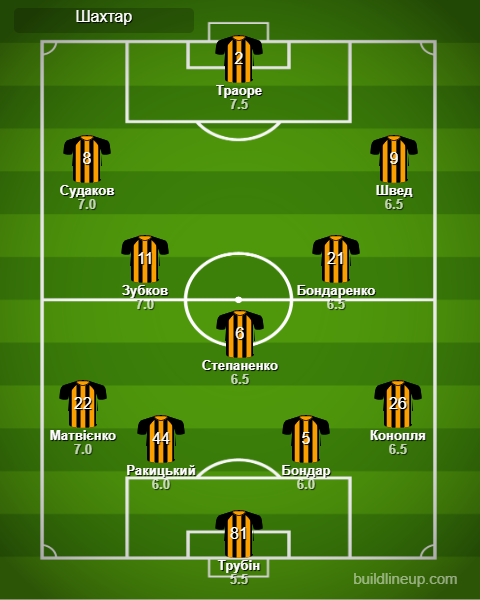 «Шахтар»: Трубін – Конопля, Бондар, Ракицький (Михайличенко, 71), Матвієнко, Степаненко, Бондаренко, Судаков (Назарина, 90), Швед (Гочолеішвілі, 71), Зубков (Тотовицький, 62), Траоре (Келсі, 70).