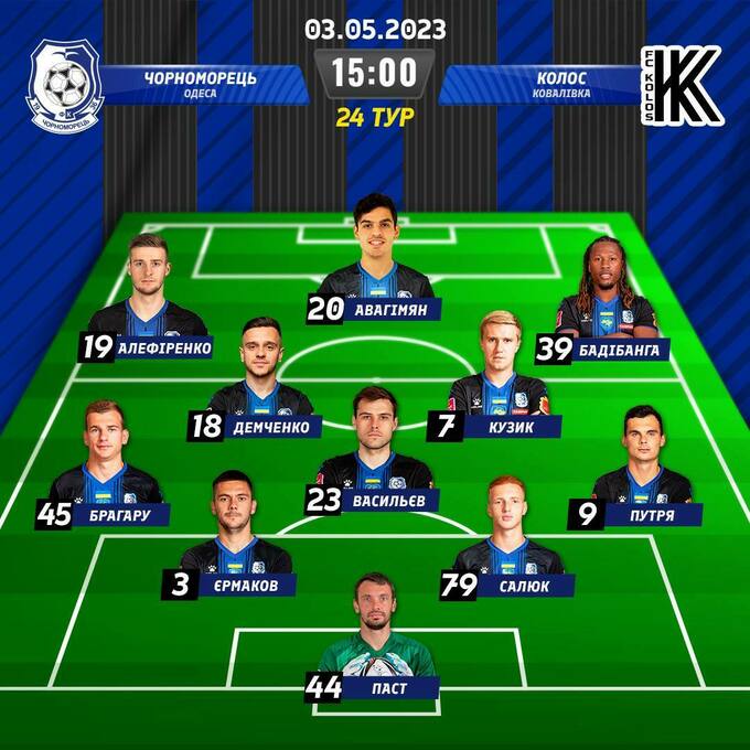 «Чорноморець»: Паст – Брагару, Єрмаков, Салюк, Путря – Демченко (Політило, 89), Васильєв, Кузик (Задоя, 83) – Алефіренко (Войтіховський, 88), Авагімян (Гладкий, 83), Бадібанга (Штогрін, 82).