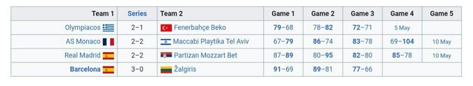 П'яті матчі серій у цих парах відбудуться 10 травня. Результат майбутніх поєдинків визначить ще двох півфіналістів. Раніше до півфіналу вийшла іспанська «Барселона».