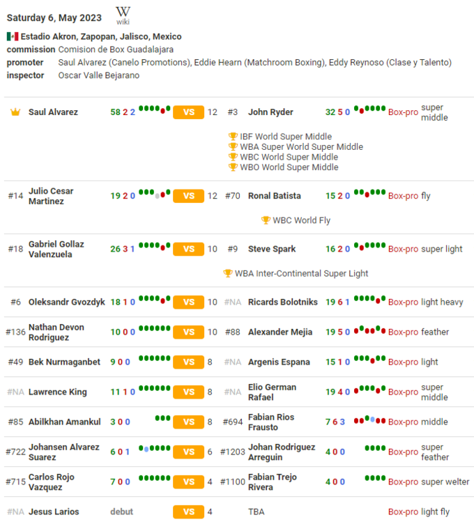 В головному бою вечора зустрінуться Сауль Альварес із Мексики (58–2–2, 39 КО) та Джон Райдер із Великобританії (32–5, 18 KO).