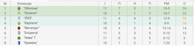 «Оболонь» вирвала перемогу у «Епіцентра» (2:1) і тимчасово посіла першу позицію в Чемпіонській групі. Київський клуб має 24 очки після 11 ігор, а найближчий переслідувач «Полісся», у якого одна гра в запасі, – 22.