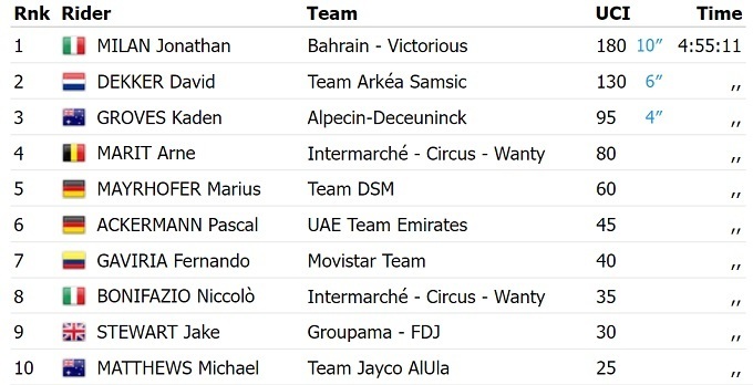 Італійський велогонщик команди «Bahrain Victorious» Джонатан Мілан став переможцем другого етапу Джиро д'Італія-2023. У фінішному спринті він випередив нідерландця Давіда Деккера з «Arkea Samsic» і австралійця Кейдена Гроувза з «Alpecin Deceuninck».