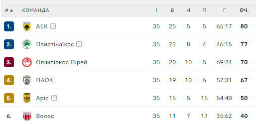 В іншому матчі ігрового дня АЕК у гостях обіграв Аріс (2:1) і дуже близький до чемпіонства. Весь матч за АЕК відіграв хорват Домагой Віда, екс-захисник Динамо.