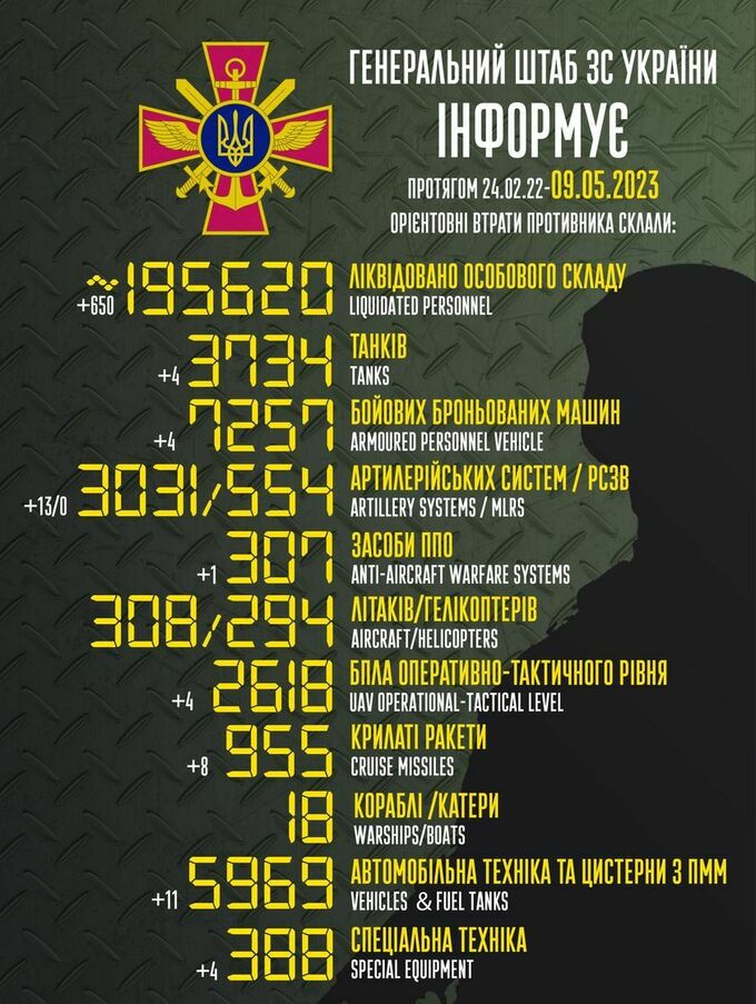 Пропонуємо до вашої уваги зведення загальних бойових втрат росії з 24.02.2022 по 09.05.2023.