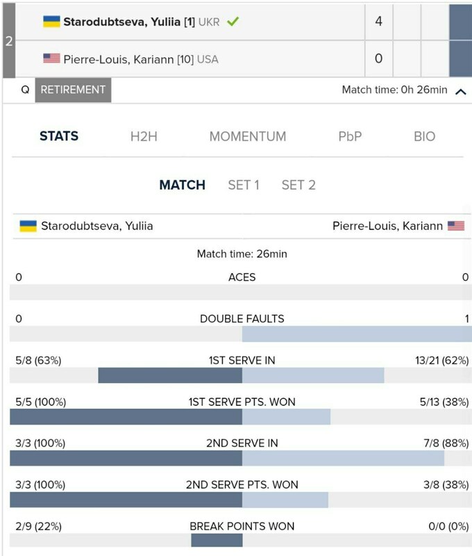 Юлія Стародубцева (Україна) – Каріанна П'єр-Луїс (США) – 4:0, RET., П'єр-Луїс