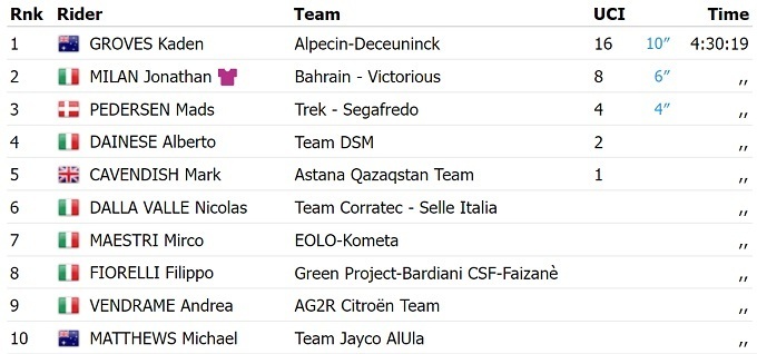 Австралійський велогонщик команди «Alpecin Deceuninck» Кейден Гроувз став переможцем п'ятого етапу Джиро д'Італія-2023. У фінішному спринті в Салерно він випередив італійця Джонатана Мілана з «Bahrain Victorious» і данця Мадса Педерсена з «Trek Segafredo».