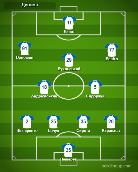 «Динамо»: Нещерет, Вівчаренко (Дубінчак, 71), Дячук, Сирота, Караваєв, Сидорчук, Андрієвський (Лонвейк, 78), Буяльський, Волошин (Царенко, 71), Беніто (Перріс, 71), Ванат (Рамірес, 82).
