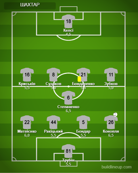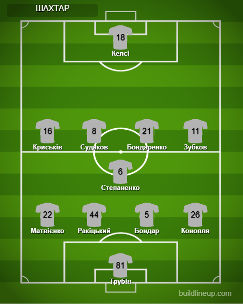 «Шахтар»: Трубін - Конопля (Гочолеішвілі, 60), Бондар, Ракіцький (Михайліченко, 69), Матвієнко - Степаненко - Зубков (Швед, 69), Бондаренко, Судаков, Криськів (Тотовицький, 73) - Келсі (Сікан, 60).