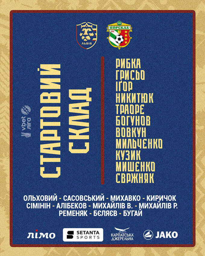 «Львів»: Рибка – Ґабріель, Вовкун, Никитюк – Кузик (Р. Михайлів, 71), Мильченко, Мишенко (Алібеков, 81), Грисьо – Траоре (Сімінін, 19), Свржняк (Бугай, 46), Богунов (Ременяк, 71).