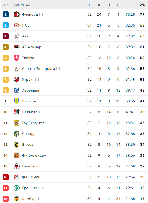 Підопічні Арне Слота набрали 79 очок та стали недосяжними для конкурентів. Далі йдуть: ПСВ (68 очок), Аякс (63), АЗ Алкмар (61).