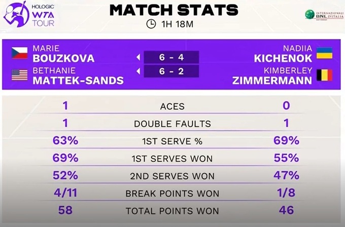 Українська тенісистка Надія Кіченок завершила виступи в парному розряді на ґрунтовому турнірі серії WTA 1000 у Римі (Італія).