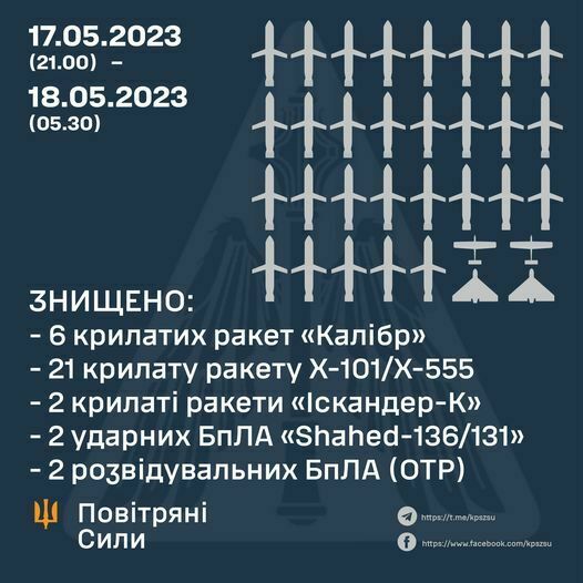 Сили ППО зуміли збити 29 з них, включаючи 6 ракет Калібр, 21 ракету Х-101/Х-555 та 2 ракети Іскандер-К. Крім того, українська ППО збила два дрони-камікадзе і три розвідувальні дрони.