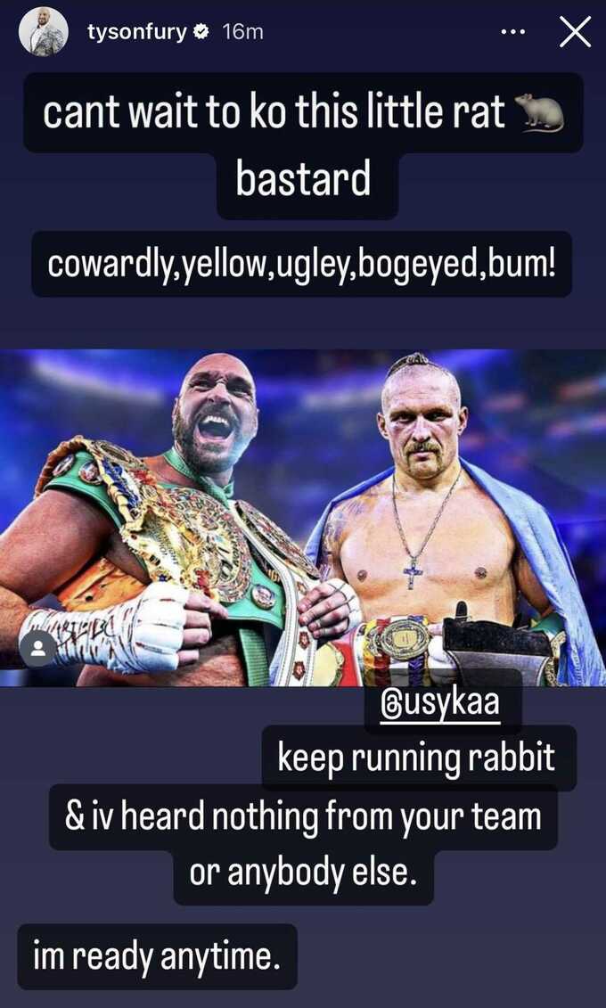 Продовжуй бігати, кролику. Я нічого не чув ні від твоєї команди, ні від когось іншого. Я готовий у будь-який час», – написав Ф'юрі в інстаграмі.