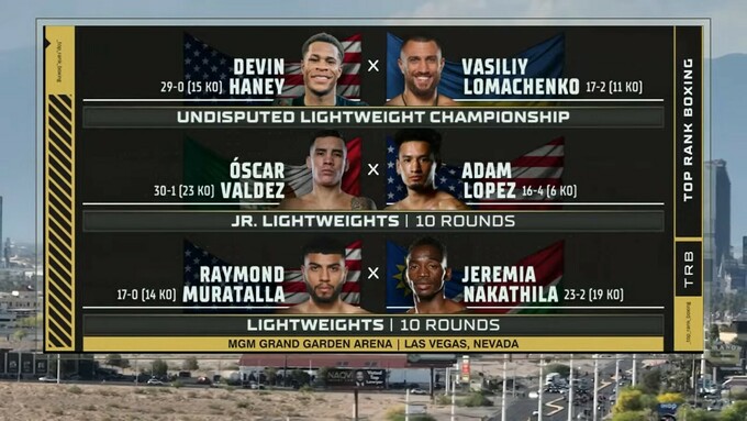 На ринг вийдуть український боксер Василь Ломаченко (17–2, 11 КО) та чемпіон світу за чотирма основними версіями Девін Хейні зі США (29–0, 15 KO).