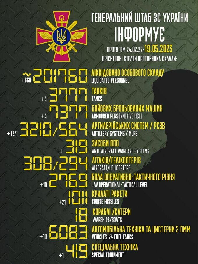 Пропонуємо до вашої уваги зведення загальних бойових втрат росії з 24.02.2022 по 19.05.2023.