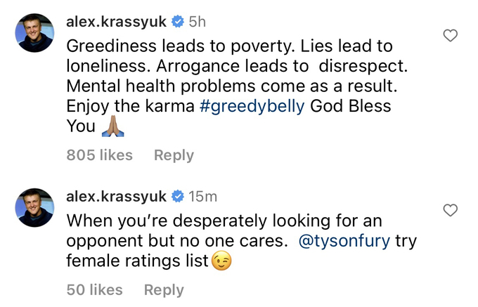 Коли ти відчайдушно шукаєш суперника, але нікого це не цікавить. Ф'юрі, спробуй список жіночих рейтингів», – написав Красюк в коментарях до посту британця.