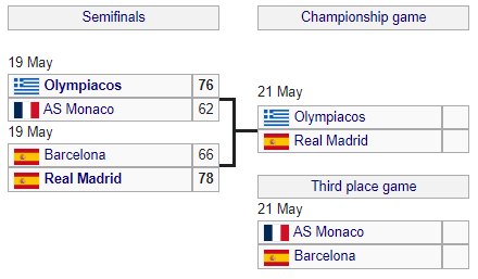 У фінальному матчі 21 травня у Каунасі зіграють «Олімпіакос» та «Реал». Третє місце розіграють «Монако» та «Барселона».