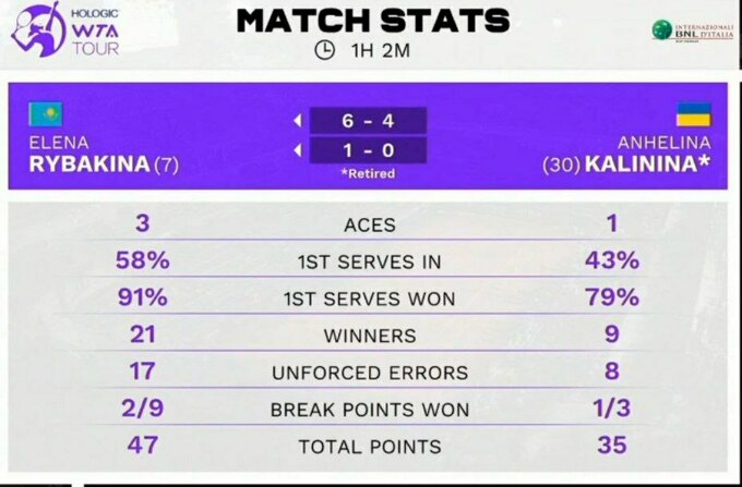 Калініна програла Рибакіній перший сет і знялася з фіналу турніру в Римі
