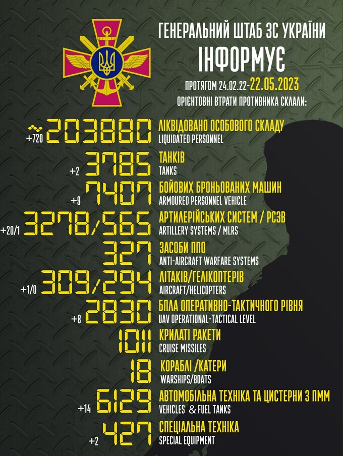 Пропонуємо вашій увазі зведення загальних бойових втрат росії з 24.02.2022 по 22.05.2023.