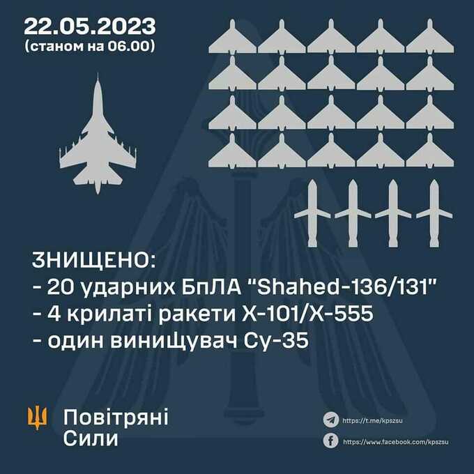 «Ще мінус один ворожий літак! Наприкінці доби 21 травня в територіальних водах України, на Херсонщині, впав російський винищувач Су-35! Обставини, що це спричинили, уточнюються!», – сказано у повідомленні Генштабу ЗСУ.