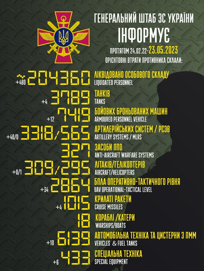 Пропонуємо до вашої уваги зведення загальних бойових втрат росії з 24.02.2022 по 23.05.2023.