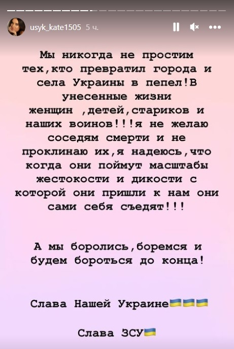 «Ми ніколи не пробачимо тих, хто перетворив міста України на попіл. Ви забрали життя жінок, дітей, людей похилого віку і наших воїнів. Я не бажаю сусідам смерті і не проклинаю їх, я сподіваюся, що, коли вони зрозуміють масштаби жорстокості і дикості, з якою вони прийшли до нас, вони самі себе з'їдять. А ми боролися, боремося і будемо боротися до кінця. Слава нашій Україні. Слава ЗСУ», – написала Катерина в інстаграмі.