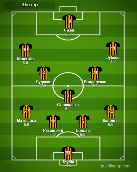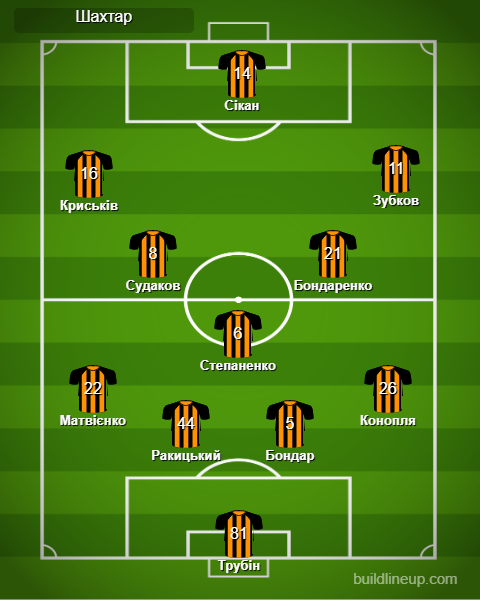 «Шахтар»: Трубін, Бондар, Степаненко, Судаков (Назарина, 77), Зубков, Сікан (Келсі, 81), Криськів (Топалов, 77), Бондаренко, Матвієнко, Конопля (Гочолеішвілі, 77), Ракицький (Джурасек, 84).