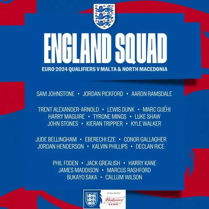 Головний тренер збірної Англії Гарет Саутгейт оголосив заявку команди на матчі відбору на Євро-2024 проти Мальти та Північної Македонії (16 та 19 червня відповідно):