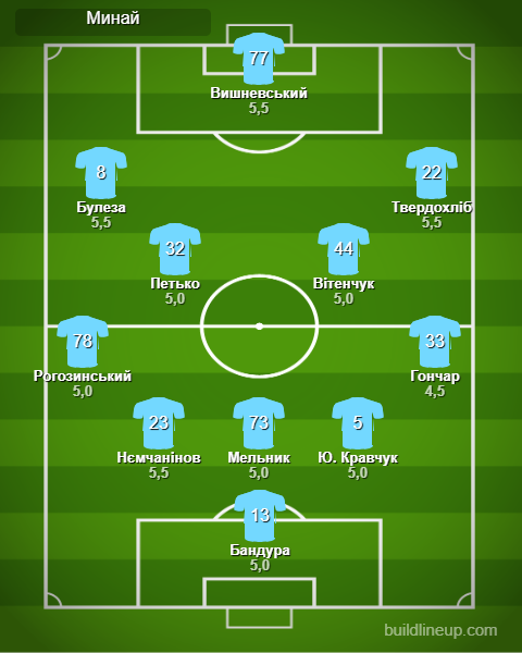Заміни Миная: Дмитрук 4,5, Шишка - 4,5, Чуєв - б/о, Коломоєць - б/о, Гечев -б/о.