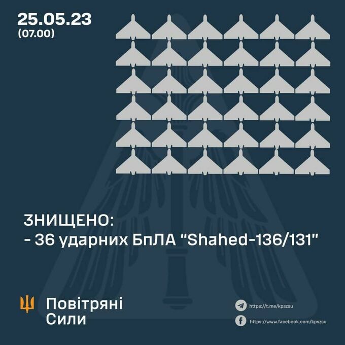 Генеральний штаб Збройних сил України повідомив про те, що в ніч на 25 травня 2023 року ворог атакував Україну ударними дронами іранського виробництва Shahed. Сумарно було зафіксовано пуск 36 баражувальних боєприпасів. Він був виконаний із північного та південного напрямків.