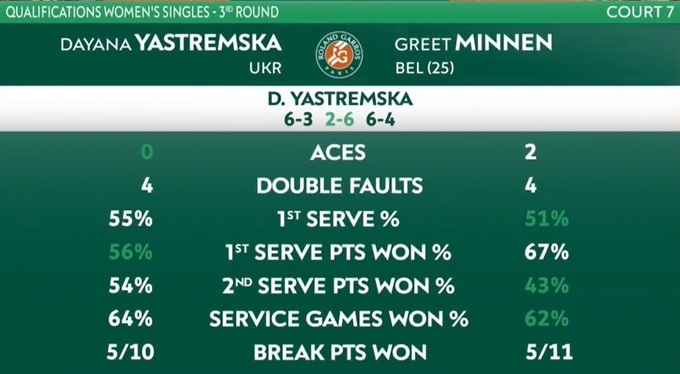 Цікаво, що цього року Ястремська вперше грала у кваліфікації французького мейджора. Раніше вона тричі проходила в основу за рейтингом, але щоразу поступалася в першому раунді.