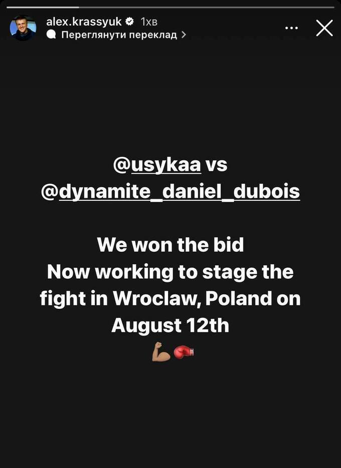 Український промоутер Олександр Красюк у своєму Instagram оголосив, що компанія K2 Promotions виграла торги на організацію бою Олександр Усик – Деніел Дюбуа: