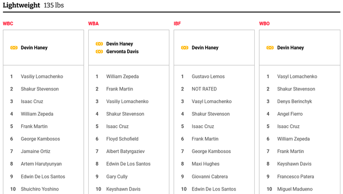 У рейтингу WBA Ломаченко йде 3-м, у рейтингу WBO – 1-м, а в рейтингу IBF – 3-м.