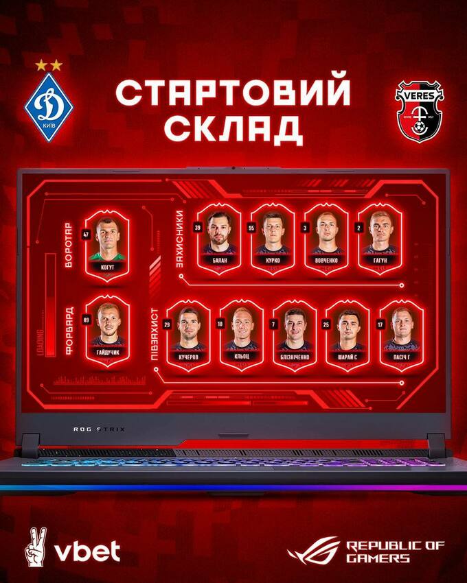 «Динамо»: Бущан, Караваєв, Дячук, Сирота, Дубінчак, Сидорчук, Андрієвський (Шапаренко, 77), Беніто (Тимчик, 46), Кабаєв (Волошин, 65), Буяльський (Царенко, 77), Рамірес (Гармаш, 65).