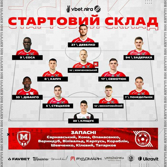 «Кривбас»: Кліщук – Дібанго, Стецьков, Бескоровайний, Понєдєльнік (Опанасенко, 90+2) – Капіч, Хомченовський, Семотюк (Кораблін, 72) – Соса (Шевченко, 90+2), Дебелко, Задерака (Татарков, 62).