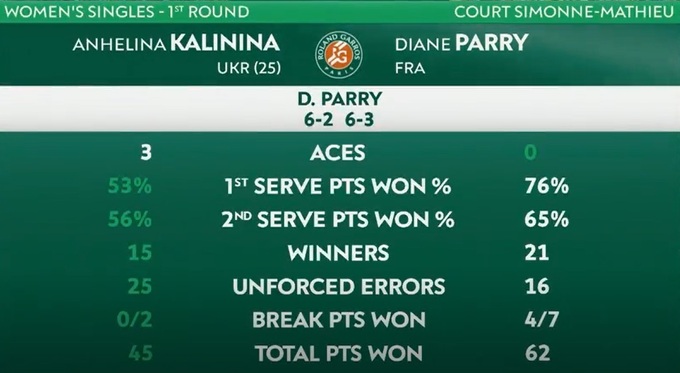 Ангеліна Калініна (Україна) – Діан Паррі (Франція) – 2:6, 3:6
