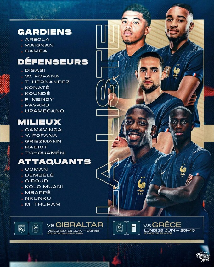 16 і 19 червня збірна Франції проведе два матчі відбору на Євро-2024 – проти Гібралтару та Греції відповідно. Головний тренер збірної Франції визначився зі списком гравців, які будуть викликані на ці матчі.