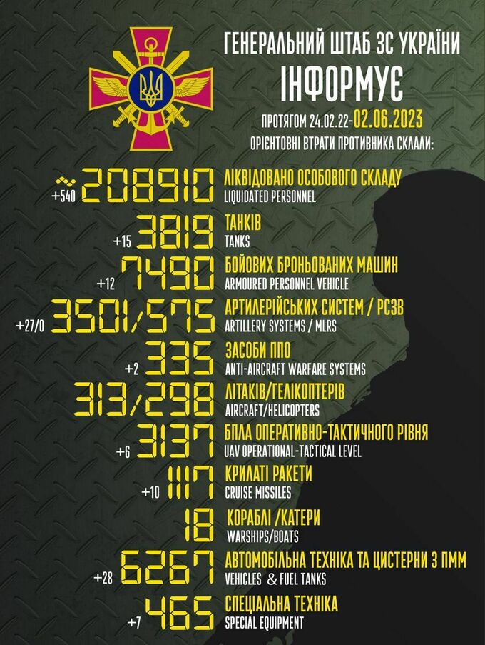 Пропонуємо вашій увазі зведення загальних бойових втрат росії з 24.02.2022 по 02.06.2023.