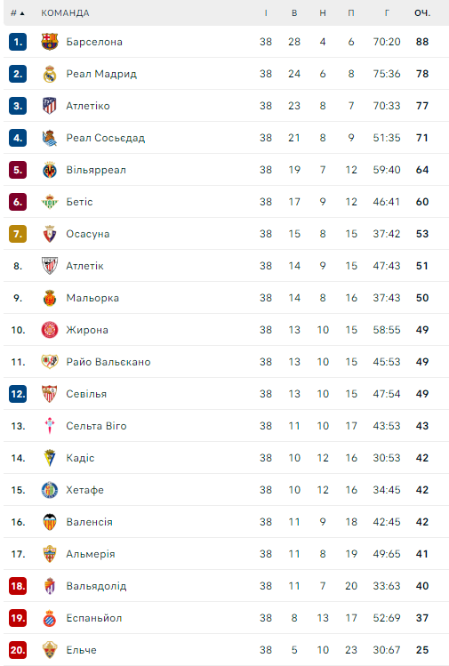 Залишають Ла Лігу: Вальядолід (40 очок), Еспаньол (37) та Ельче (25).